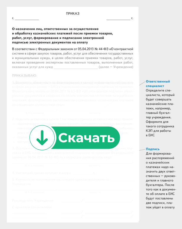 Для подписания распоряжений о казначейских платежах надо назначить двух ответственных — руководителя и главного бухгалтера. После того как в документе об оплате в ЕИС будут поставлены две подписи, платеж уйдет в оплату. Формировать документы придется тщательнее, чтобы не уйти на повторный контроль и не сорвать сроки оплаты по контракту. Как оформить приказ, показали на образце.