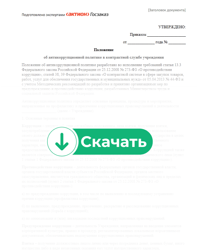 Антикоррупционное положение документ, который теперь должен быть у каждого заказчика. Это связано с тем, что в статью 38 Закона № 44-ФЗ включили отдельную обязанность принимать меры для недопущения конфликта интересов по правилам Федерального закона от 25.12.2008 № 273-ФЗ «О противодействии коррупции». Чтобы не составлять отдельный документ по антикоррупции, допустимо дополнить свое положение о контрактной службе антикоррупционными тезисами.